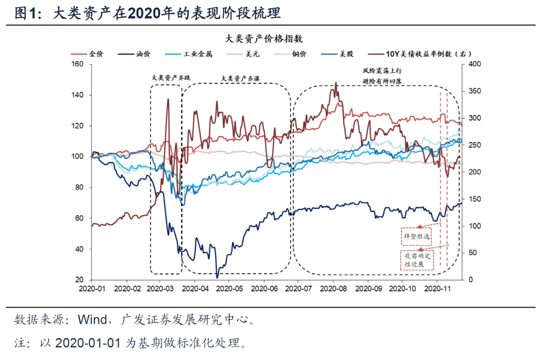 2020年大类资产表现脉络:流动性危机—>宽松驱动—>波折中的复苏交易。2020年,大类资产共计经历三个阶段的表现。阶段一:2020年Q1,原本处于扩张晚周期的欧美经济在新冠疫情的触发之下,出现流动性危机,各类资产齐跌。阶段二:2020年Q2,全球央行财政通力合作,无限流动性宽松支持全球走出流动性危机,全球进入宽松交易,各类资产齐涨。阶段三:2020年Q3以来,海外央行保持宽松但缺乏增量信息。全球经济波折中复苏,风险资产震荡上涨、避险资产有所回落。
