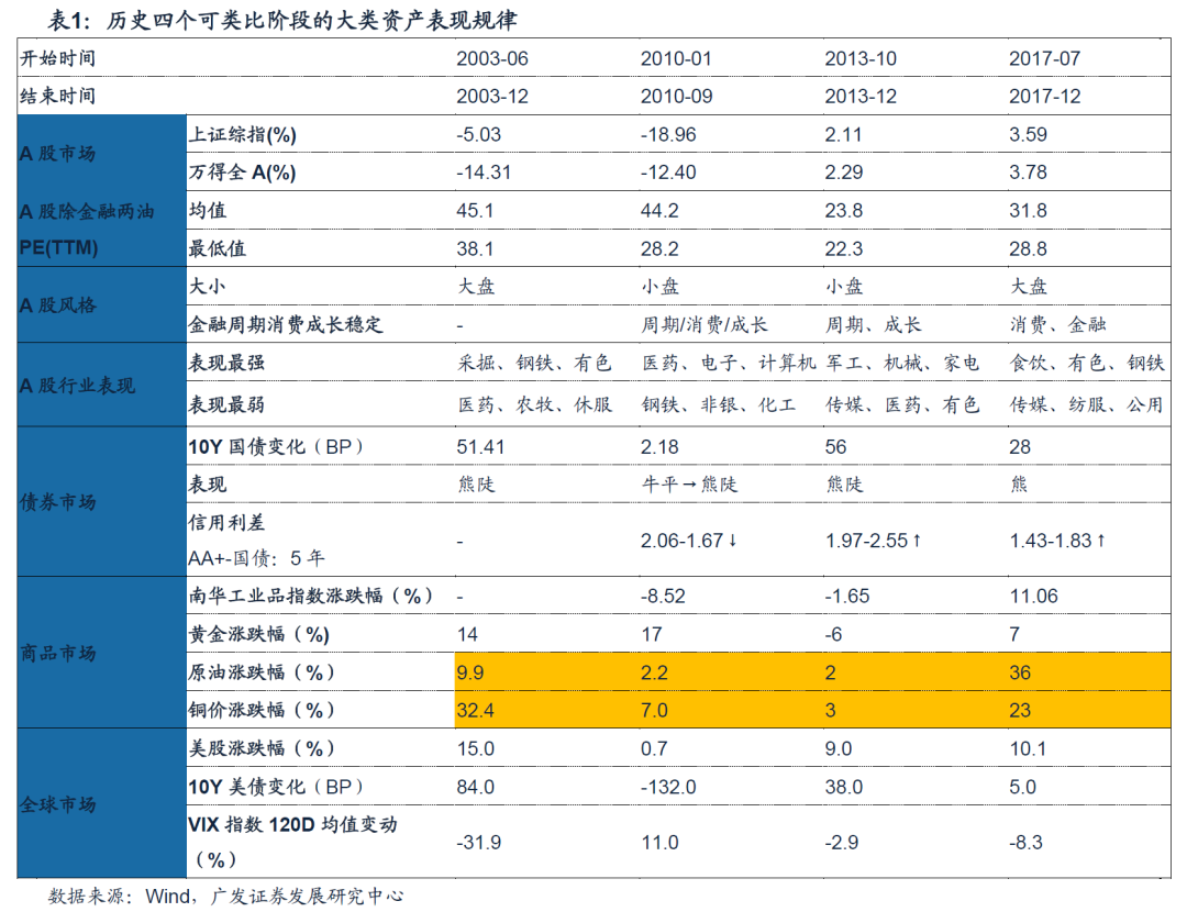 2021年,大类资产表现如何展望?从金融条件、盈利周期位置锚定大类资产的参考时段。明年大类资产中有两条确定性较高的线索:(1)全球经济继续修复,海外修复弹性高于中国;(2)中国进入盈利修复+信用进一步向中性回归的阶段。寻找中外经济均上行,但海外经济增速的上行弹性高于中国的阶段:(1)03Q2-03Q4;(2)09Q4-10Q3;(3)13Q3-13Q4;(4)17Q2-17Q4。中国货币和信用条件进一步收敛+盈利修复先上后下但仍处于较高区间的可参考历史时段有(1)03年6月-04年10月、(2)10年1月-12月、(3)13年6月-14年3月、(4)17年7月-12月。