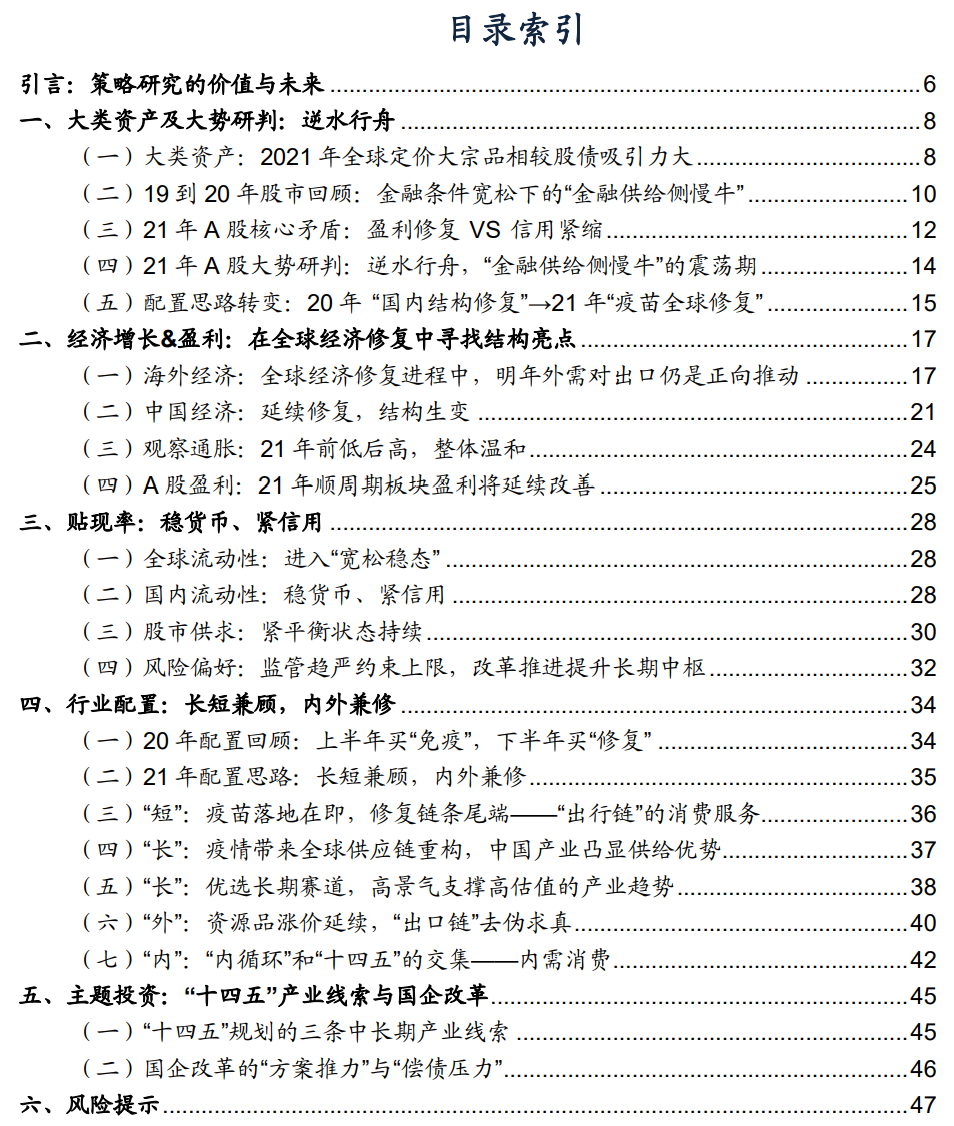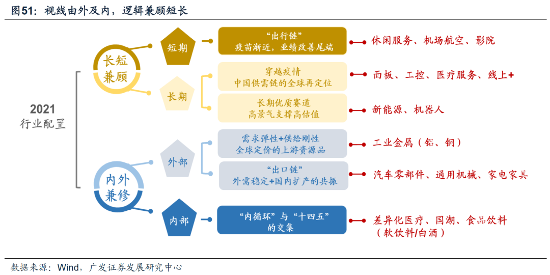 首先,视野“由短及长”:1. 短期视野聚焦疫苗交易,业绩修复预期传导至最末端的“出行链”(休闲服务、航空机场、影视院线);2. 长期视野关注在海外复工恢复后、中国供需链在全球的再定位(电气设备、机械设备),3. 同时继续配置长期优质赛道下高景气支撑高估值的产业趋势(新能源、工业机器人)。其次,格局“由内而外”:4. 外部两条线索:其一是全球定价的资源品(工业金属),其二是外需稳定与国内扩产的共振拉升的“出口链”(家具、家电);5. 内部关注“内循环”政策与“十四五”规划的交集,尤其是高品质内需(医美、创新药、国潮、软饮、白酒)。主题投资:“十四五”产业线索与国企改革。