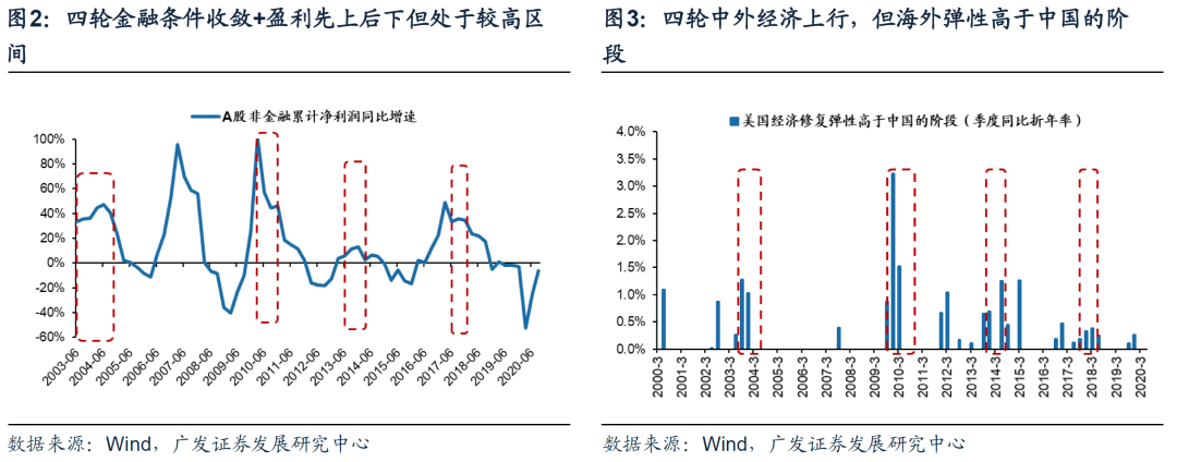 两者具备极大的相似性,通常金融条件收紧略有滞后。在全球经济共振、外需有支撑的阶段,中国往往处于盈利修复+金融条件收紧的组合当中,金融条件收紧制约盈利修复强度,因此盈利呈现先上后下的形态。