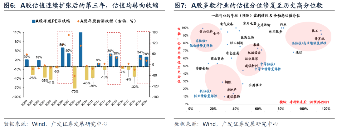 从A股估值的年度变动规律来看,2000年以来A股从未出现过连续3年拔估值,连续2年拔估值仅出现在:06-07、14-15、19-20。06-07年是经济强复苏,14-15是流动性显著宽松,19-20年在疫情发酵下全球宽松亦较为罕见。因此在经历了连续2年拔估值后,21年A股估值大概率转向收缩,2021年A股难以复刻06-07年的盈利强复苏、也很难复刻14-15、19-20年的贴现率猛下行,需要合理降低21年A股收益率预期。