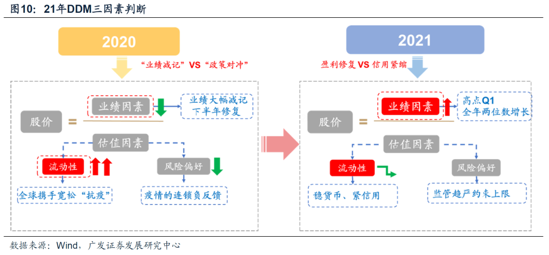 2020年DDM三因素中的核心驱动在分母端,虽然疫情带来业绩大幅减记,但流动性宽松带来贴现率下行支撑估值扩张。
