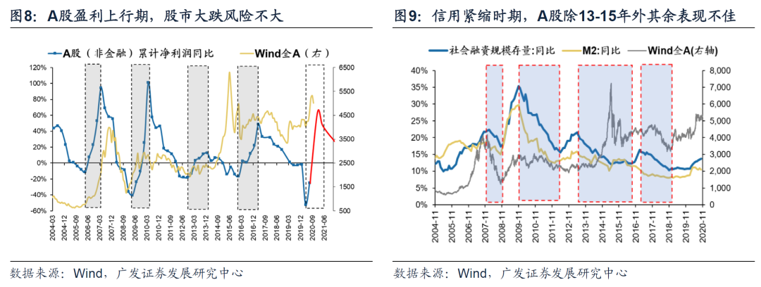 但另一方面,2021年也是信用紧缩周期,历史上信用收缩对A股大多形成压制。除了13-15年的紧信用周期A股成长股引领牛市外,其余信用紧缩时期A股往往表现不佳。21年全年A股趋势取决于盈利回升能否盖过估值收缩的幅度。