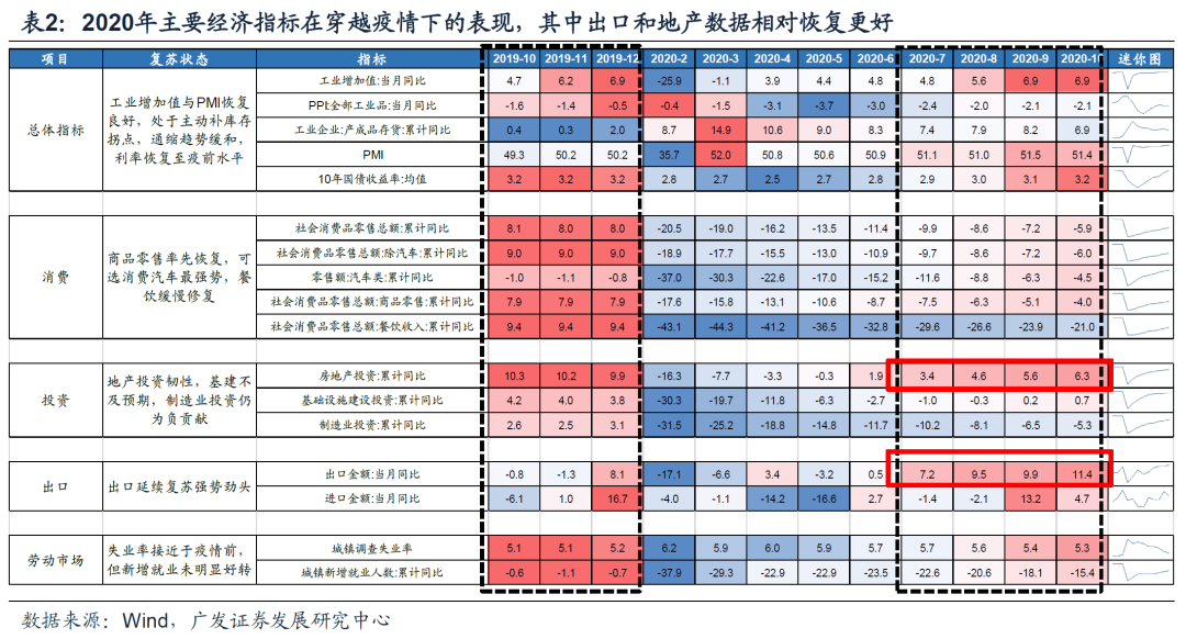 首先,20年下半年中国经济超出市场预期的主要原因来自于出口,从疫情前、疫情中、疫情后各项中国经济指标修复位置来看,达到疫情前水平的指标依然不多(出口和地产最优),因此2021年盈利继续修复仍是主旋律。以19年末、20年上半年、20年下半年,中国宏观经济指标的趋势总览来看,下半年经济全景自疫情中修复,但回到疫情前水平的指标寥寥,仅出口和地产数据呈现相对亮点——1. 工业增加值与PMI恢复良好,工业企业处于主动补库存周期的拐点,通缩趋势缓和,利率基本恢复疫前水平;2. 消费方面,商品零售率先恢复,可选消费中汽车最强势,而餐饮等服务业缓慢修复;3. 投资方面,地产投资韧性,基建不及预期,制造业投资仍为负贡献;4. 出口是下半年的亮点,呈现复苏劲头,横向对比数据改善最优;5.劳动市场方面,失业率接近于疫情前,但新增就业未明显好转。