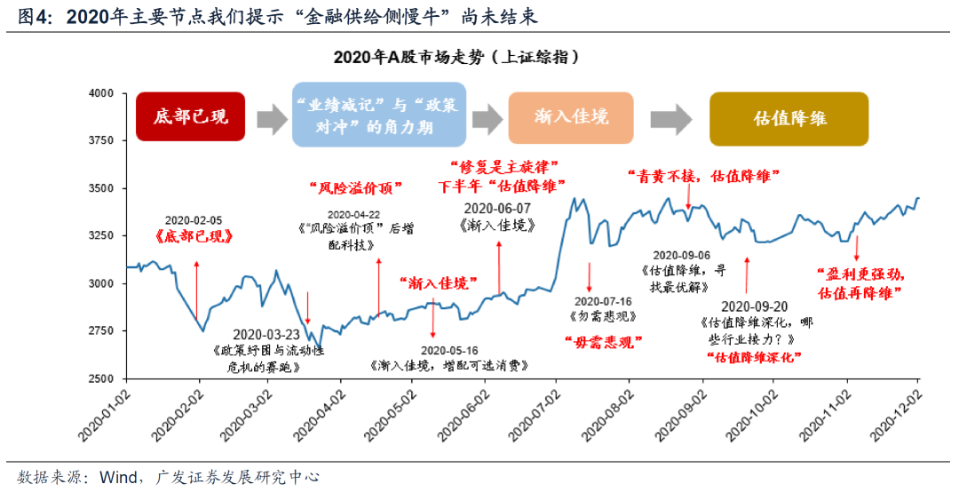 只要厘清慢牛的核心驱动力不变,我们20年在市场分歧放大的节点,持续提示以年为计的金融供给侧慢牛尚未结束。我们在2.5《底部已现》判断“我们去年初提出的贴现率下行驱动金融供给侧慢牛并不会因疫情而破坏,从逻辑、估值、交易等层面看到积极曙光”并对A股转向乐观;3.23《政策纾困与流动性危机的赛跑》我们提示“流动性宽松比疫情进展更重要!”;6.7《渐入佳境—2020年A股中期策略展望》鲜明提出“下半年经济修复是主旋律”,下半年行业配置坚持“估值降维”;7.16《毋需悲观》在市场恐慌下跌时坚定提示“贴现率下行驱动的金融供给侧慢牛不变”;在下半年的多篇报告中持续给出“估值降维”的配置思路沿经济修复路径中游制造、可选消费服务、大金融依次展开,并坚持将新能源作为新兴产业中估值降维的首选推荐。