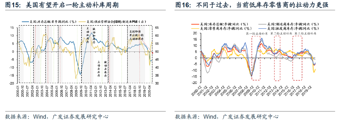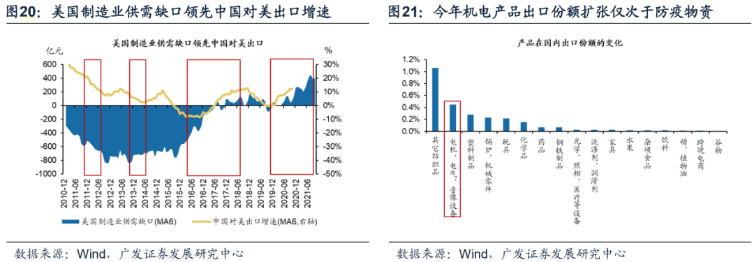 海外经济修复动力二:主动补库与资本开支周期。当前美国库存处于历史低位,制造业景气上行需求回升背景下,有望开启主动补库周期和资本开支周期。结构上,汽车是本轮美国库存低位的主要下拉产品,预计也是未来补库的主要拉动分项。美国本轮补库结构与中国优势出口产品的对应情况:中国家具、家电类产品相对受益,而电气设备、工业机械等当前库存仍相对较高。