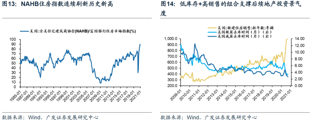 海外经济修复动力一:地产投资对经济拉动仍将持续至少1-2个季度。超低利率带来购房成本下行+疫情带来的居住改善需求,使得2020年美、欧、英均出现地产销售的向上共振。美国9月以来地产景气度连续创出历史最高,新屋销售攀升至09年以来最高水位,而新屋及成屋库存都处于历史极低水平。美国地产景气指数为投资的领先指标,在低库存、高景气度之下,未来1-2个季度美国地产投资仍处于回升阶段。