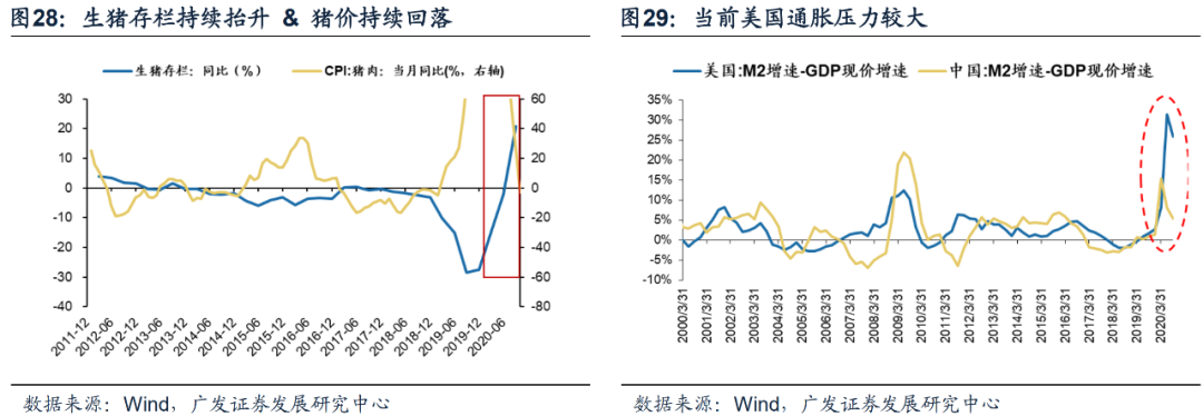 经济复苏带来价格上行压力,但海内外多因素对冲下,21年通胀压力相对温和。2021年通胀的上拉项主要来自于海外需求和价格冲击,即全球经济在疫苗和财政刺激下复苏带来的再通胀;下拉项则主要来自于生猪供给逐步恢复下,猪周期的回落。另一方面,2020年三季末,美国的M2增速-GDP增速连续两季度超过20%,远高于我国的5.4%,明年美国面临的通胀压力相对较大;但当前中美利差创新高,人民币升值趋势可对冲缓解输入性通胀压力。节奏上,在低基数效应+全球经济复苏的背景下,21年通胀将逐步回升,预计2021年CPI口径通胀前低后高,全年约为2.2%。