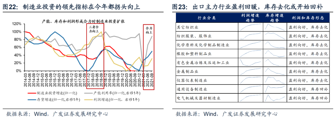 制造业投资扩产在即,出口链的投资有望实现积极扩张。产能、库存增速和企业盈利增速是制造业投资的领先指标。从产能的角度看,若产能难以满足后续的扩大生产,制造业投资增速将会相应提升,历史上两者有正相关性。其次,从库存的角度看,作为调节有效供给的蓄水池,与制造业投资之间也有一年左右的时滞。第三,从资金的角度看,企业利润是制造业投资资金来源的核心,与制造业投资的相关性比贷款更强(盈利预期不好的时候,企业即使拿到贷款也不一定会投资,比如2015年),经验上企业盈利也领先制造业投资一年。历史上当这三者形成向上的合力时,往往指向后续制造业投资会有所扩张,典型的如2017年。今年这三个指标均触底回升,再次形成向上的合力,指向明年中国制造业扩产在即。结构上,今年国内出口的主导行业基本都实现了盈利增速的回升,行业库存水平下降或已经开始回补。前述判断明年国内出口依然维持中性偏高的景气度,对应出口链条的制造业投资也有望积极扩张。