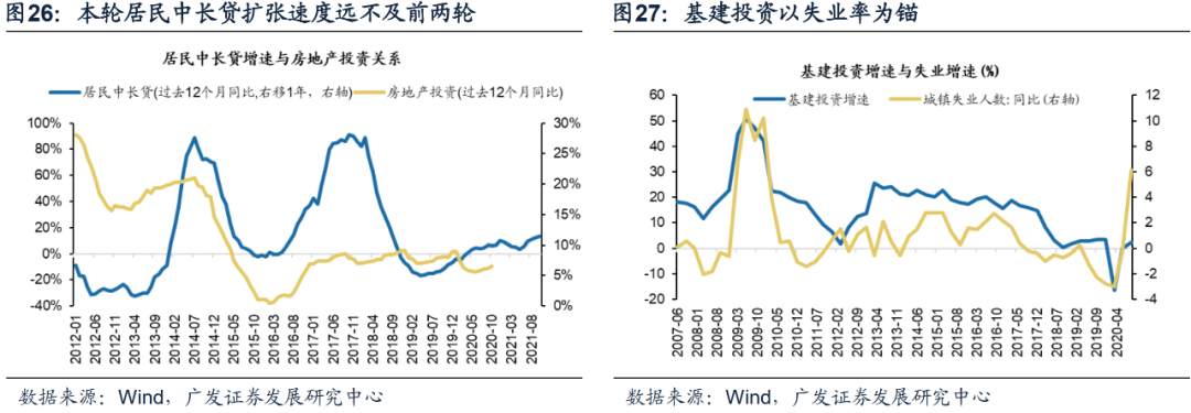 地产基建投资明年强度不高,可能对经济整体复苏强度有所制约。今年地产景气度的回升实际上只能定义为小周期,因为今年严格意义上的宽货币时间很短,只有一个季度左右,导致房贷利率回落幅度有限,叠加限购限贷政策的影响下,居民中长期贷款的扩张速度远低于前两轮。这意味着房企后续回款力度也不会像前两轮周期那样强,会约束本轮地产投资的整体强度。结构和节奏上,考虑到拿地与土地购置费之间1年左右的时滞,明年上半年的地产投资还会有土地购置费的支撑,下半年会走弱。基建在中国经济中更多扮演“托底”的角色,而且相较于“稳增长”,政策对基建“稳就业”的诉求更高,历史上基建增速与国内失业人口增速具有较强的相关性,明年随着就业环境的改善,国内对基建投资的诉求也会下降。