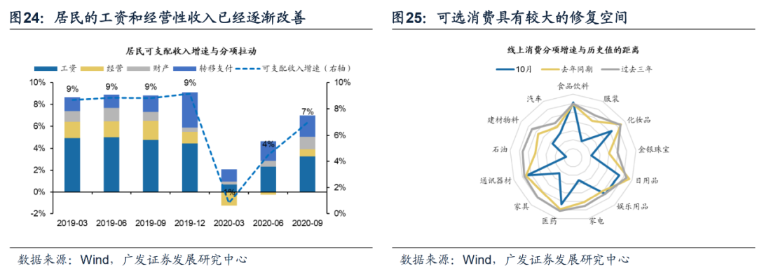 国内居民的消费意愿和消费能力会逐渐好转,结构上可选消费空间更大。今年前三个季度,城镇居民可支配收入增速同比下降0.3%,主要是工资性收入和经营性收入较疫情前有所萎缩,但从趋势上看,随着经济摆脱疫情扰动,工资性和经营性收入增速逐渐修复。居民收入是经济增长的慢变量,正常情况下短期内不会出现太大变化,具有较强的刚性,明年国内经济向着常态化回归,预计居民收入增速也会恢复至正常水平。消费意愿可以用居民储蓄来侧面衡量,历史上与失业率高度相关,今年二季度以来国内就业环境显著改善,失业率从6.2%的高点下降至5.3%,就业环境的趋势性改善会提高居民的支出意愿,助力国内消费复苏。结构上,目前服装、金银珠宝、家电、家具、建材、石油制品等消费与疫情前还有明显的差距。随着居民收入增速的回暖和消费意愿的改善,这些可选消费品的需求会逐渐回升,明年修复的空间较大。