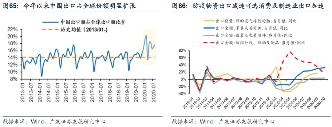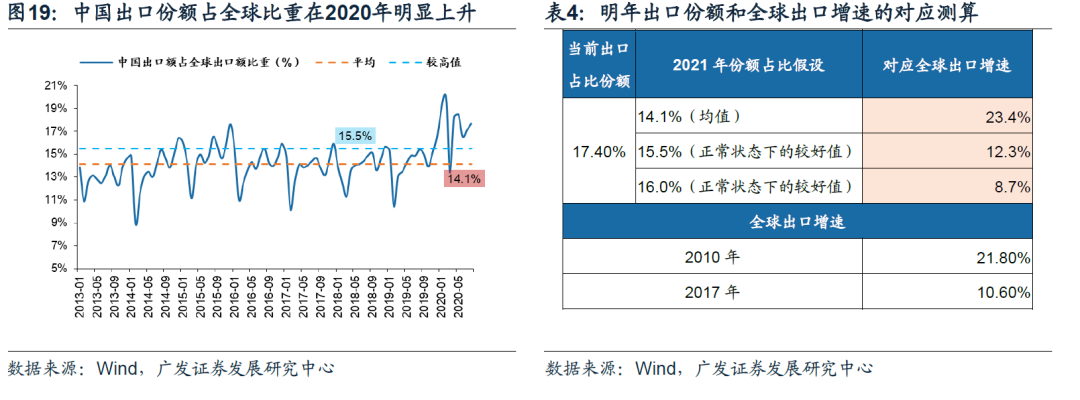 在不计入通胀的情况下进行假设计算,若中国明年出口份额能够实现正常状态下的较好水位15.5%或16.0%,则全球出口增速分别在12.3%和8.7%以上,即可实现出口对中国经济的正向推动,2017年全球经济复苏阶段全球出口增速为10.6%,而2010年从次贷危机深坑爬坡阶段的出口增速则达到了21.8%,在今年低基数效应下,明年全球的出口增速可以相对乐观预期。另外,考虑到海外供应链恢复需要时间;且对于此前中国份额趋势性扩张的产品,疫情只是加速这一现象,相对比较优势之下,份额可能留存于中国,因此2021年全年的中国实际出口份额占比或高于往年正常状态下的较好值。因此,尽管可能存在着部分今年扩张的出口份额回吐,但明年海外需求对中国经济大概率仍是正向推动。
