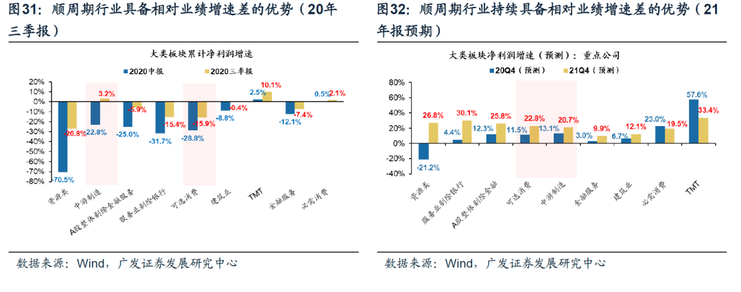 21年顺周期板块盈利持续改善,可选消费的相对业绩优势将超越中游制造。结构上来看,20年三季报顺周期板块(中游制造/可选消费)的“相对业绩增速差”优势凸显,其中,中游制造的“相对业绩增速差”显著领先可选消费。数据上来看,三季报大类板块的“相对业绩增速差”的加速幅度分别为:顺周期的中游制造(26.0pct)>可选消费(12.9pct)>逆周期的TMT(7.6pct)>必需消费(1.7pct)。同时,从分析师重点跟踪公司的盈利预期来看,21年顺周期板块的“相对业绩增速差”仍将优于逆周期板块(TMT/必需消费),不过可选消费的“相对业绩增速差”优势将超越中游制造。数据上来看,21年报大类板块的“相对业绩增速差”的加速幅度(相对20年报)分别为:顺周期的可选消费(11.3pct)>中游制造(7.7pct)>逆周期的必需消费(-3.4pct)>TMT(-24.1pct)。