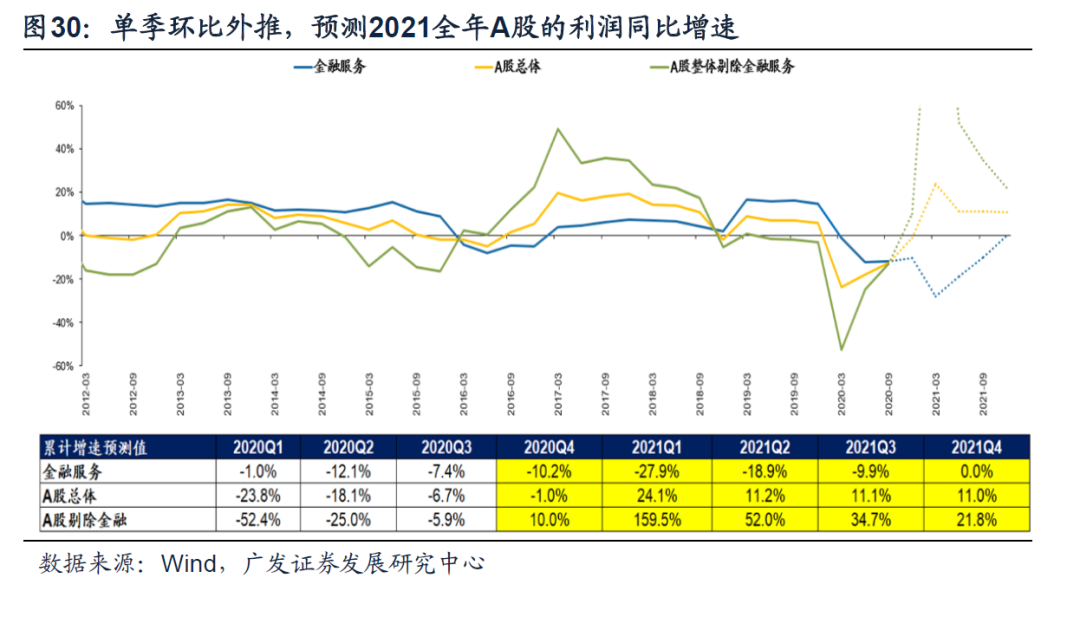 中性假设下A股剔除金融21年的盈利增速为22%,A股整体的盈利增速为11%。我们基于20年三季报和对20Q4的盈利预测,并结合21年国内外宏观经济假设,通过环比外推的方法测算A股21年盈利增速——(1)A股剔除金融服务:依据历史数据,我们设定21年A股剔除金融单季净利润增速环比一季度为10%,二季度为10%,三季度为-8%,四季度为-20%,将单季净利润通过设定环比外推,最终预测A股剔除金融21年全年盈利增速为21.8%。(2)金融服务:依靠历史数据,我们设定21年金融服务单季净利润增速环比一季度为30%,二季度为10%,三季度为4%,四季度为-2%,最终预测金融服务21年全年盈利增速为0%。(3)A股整体:将A股剔除金融服务和金融服务的预测单季净利润加总,推算出A股整体21年全年盈利增速为11%。