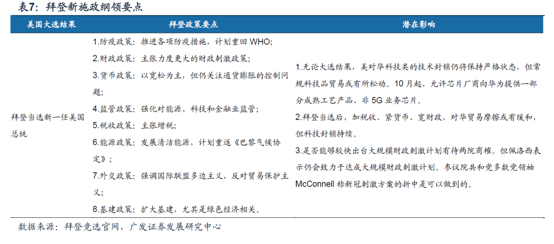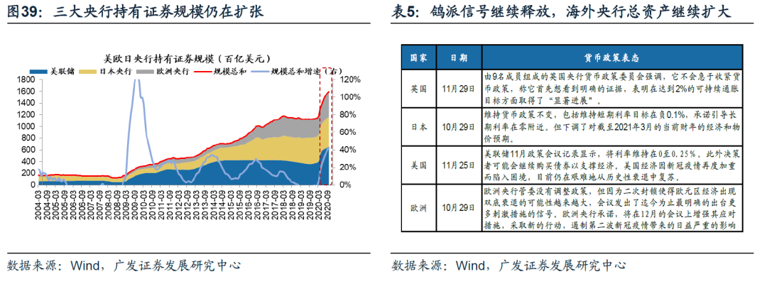 全球央行扩表阶段仍未结束,海外流动性维持宽松,但缺乏进一步宽松信息。全球央行持有证券规模仍在扩张,高杠杆、经济复苏不确定性仍强的背景下,海外流动性将维持宽松。但是,海外流动性也缺乏进一步宽松的信息和空间,海外流动性环境进入“宽松稳态”。拜登当选美国总统,2021年底到2022年初美联储或将修改前瞻指引,宽松货币政策逐步退出。