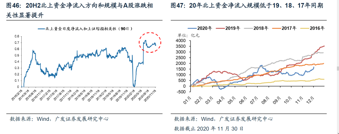 21年“紧信用”是基本确定的,在“降低实体融资成本”政策导向下,21年信用主线将是“缩量稳价”,监管环境将更重视“稳杠杆”以及风险的防范和化解。由于货币持续收紧会提升“系统性风险”的风险,预计21年货币政策将“稳健”为主,保持市场流动性合理充裕。股市供求紧平衡。预计21年北上资金净流入规模约2500-3000亿元人民币,“估值降维”结束后将重新增配消费和优质科技股,北上资金持股集中度或在明年重新提升。风险偏好上,疫苗批量上市+刺激计划出台+经济复苏,海外延续risk-on,而中国监管趋严约束风险偏好上限,改革推进提升长期风险偏好中枢。