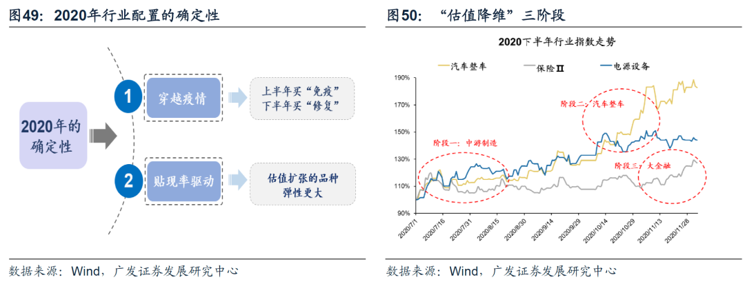 沿着估值降维的路径,20年下半年行业配置沿着三阶段渐次展开。阶段一:Q2起工业生产率先修复,市场“估值降维”率先沿着中游制造业展开,我们推荐的率先主动补库的先驱如玻璃、电气设备、通用机械等制造业显著跑赢;阶段二:下游可选消费行业Q3-Q4改善趋势有所提速,我们自9.20《估值降维深化,哪些行业接力》推荐汽车、家具、家电,及交互限制进一步放开的休闲服务、航空;阶段三:11.8《盈利更强劲,估值再降维》中我们提示分子端业绩改善的信号更强劲,“估值降维”将继续下沉至大金融(银行/保险)。