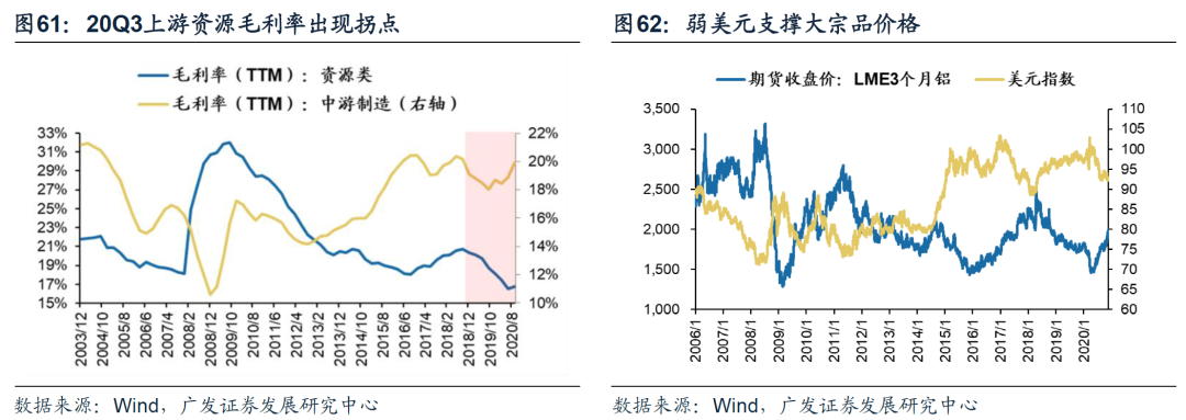 预计A股剔除金融的ROE(TTM)将持续改善到21Q2/Q3。我们在11.4发布的三季报深度《“结构性”扩产,“出口链”先行》中指出:“国内大循环”高端制造转型升级叠加全球/中国景气持续修复将驱动企业利润率持续改善;同时,兼顾消费和投资的“混合型”财政政策下,企业的周转率也会底部“弱回升”;而企业的杠杆率则会继续维系窄幅震荡。预计21年利润率将是企业ROE的主要驱动力,我们判断出口链&国内经济修复将至少持续到21年中,而企业的利润率也将驱动ROE持续改善在21年中报/三季报。