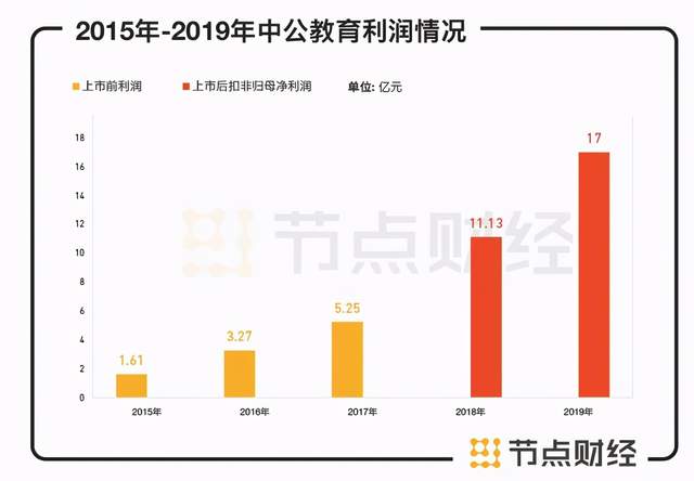 上市前,中公教育2015年-2017年利润分别为1.61亿元、3.27亿元及5.25亿元。从业绩看,中公教育几乎不可能完成对赌。但上市后,中公教育业绩暴增,2018年、2019年,扣非归母净利润分别为11.13亿元、17.00亿元,不仅顺利完成了前两年的对赌协议,还有超出部分。
