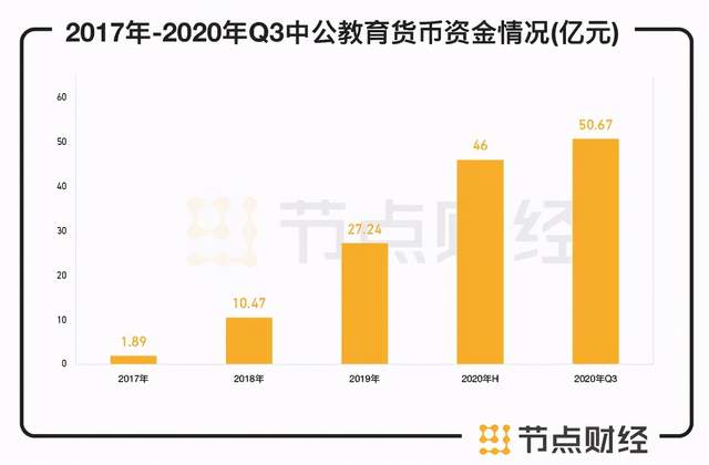 2017-2019年,中公教育账上货币资金为1.89亿、10.47亿、27.24亿,截至2020年Q3,中公教育持有货币资金超过50.67亿,今年年中报时,货币资产为46亿,也就是说,在3个月时间内,中公教育货币资金多了4个亿。