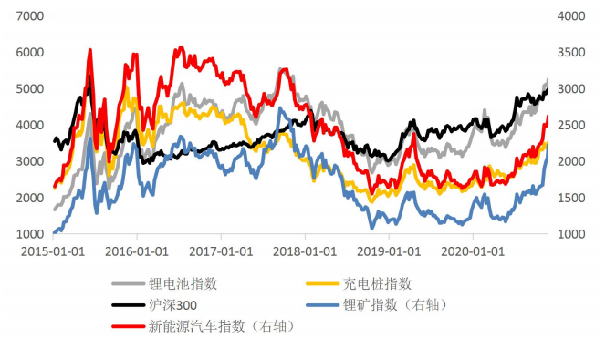 根据Wind数据统计,2018-2019年,由于政策补贴大幅退坡、汽车购置税补贴减免政策退出导致销量出现下滑,且中上游供给过剩等因素影响,新能源汽车相关概念指数跑输沪深300。