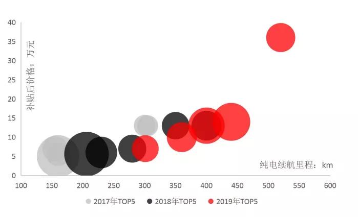 根据乘联会及汽车之家数据统计(对于有标准续航和长续航版车型,续航里程取平均值,补贴售价取平均值),2017年纯电动乘用车销量TOP5车型主要集中于续航150-300公里,补贴后售价5-13万元区间;2018年纯电动乘用车销量TOP5车型主要集中于续航200-350公里,补贴后售价5-13万元区间;2019年纯电动乘用车销量TOP5车型续航里程在300公里以上,补贴后售价提升至7-36万元区间。