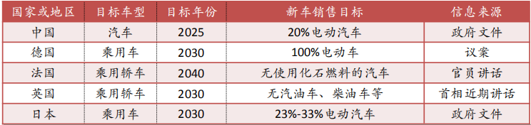 目前,除美国退出《巴黎协定》外,各参与国积极推动和践行节能减排、努力控制全球气候变化的目标和措施。多国陆续制定或正在计划设定未来汽车领域推行新能源汽车的相关目标。