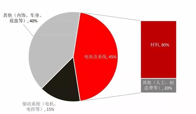 在新能源汽车销售前景向好的大趋势下,动力电池需求也将同步快速增长。根据一览众车数据显示,电池在新能源汽车成本构成中占比较高,约占总成本的45%。电池系统中,原材料占电池成本比重约80%。