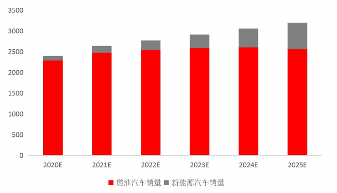 根据工信部指导、中国汽车工程学会编制的《节能与新能源汽车技术路线图2.0》,到2025年,我国汽车销量将达到3200万辆(年均增速约5%,与我国GDP预期增速相近)。