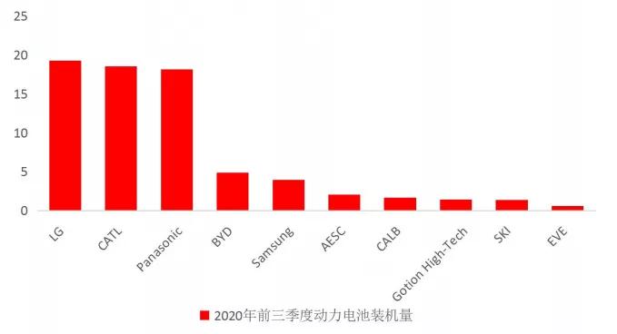 图表 11 2020年前三季度全球动力电池装机量TOP10(GWh)