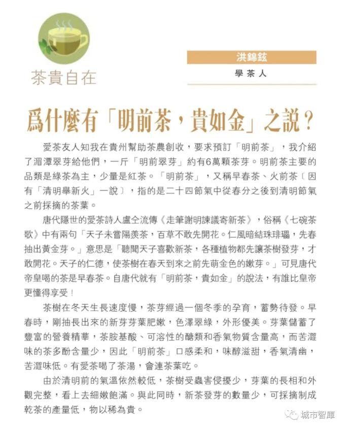 唐代隐世的爱茶诗人卢仝流传《走笔谢明谏议寄新茶》,俗称《七碗茶歌》中有两句「天子未尝阳羡茶,百草不敢先开花。仁风暗结珠琲瓃,先春抽出黄金芽。」意思是「听闻天子喜欢新茶,各种植物都先让茶树发芽,才敢开花。天子的仁德,使茶树在春天到来之前先萌金色的嫰芽。」可见唐代帝皇喝的茶是早春茶。自唐代就有「明前茶,贵如金」的说法,有谁比皇帝更懂得享受!