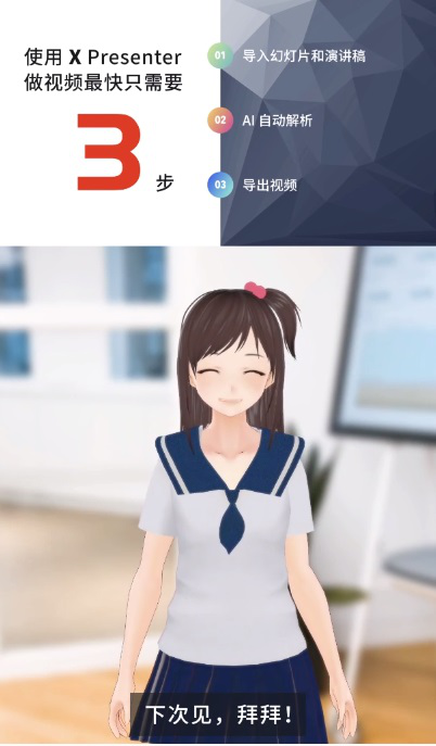 X Presenter则是通过AI行为自动解析及辅助视觉引导功能,根据用户输入的演讲稿,自动合成人工智能语音,同时解析并依此生成AI虚拟人类的演讲动作、表情、还有口型。其商业版为日本LAWSON驱动的自主舞蹈人工智能,现已上线。