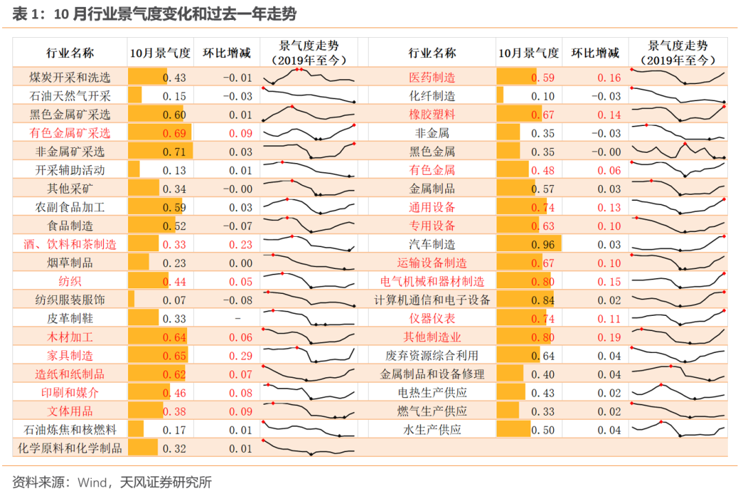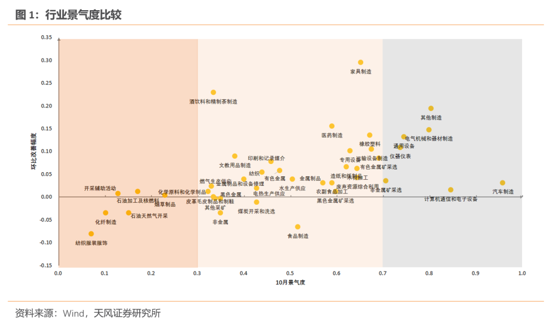 10月多数行业景气度继续上行。与9月相比,多数行业延续了复苏态势。汽车制造和计算机通信电子设备连续3个月维持高景气。其他制造、电气机械、通用设备、仪器仪表、非金属矿采选、有色金属矿采选、运输设备和橡胶塑料进入或接近高景气区间,这些行业的景气度均已超过去年同期水平。家具制造、废弃资源综合利用、木材加工、专用设备、造纸和纸制品、医药制造、食品制造、有色金属、化学原料等行业也表现出较充分的复苏,虽然景气度尚处于历史中等水平,但已高于去年同期。纺织服装、化学纤维、石油天然气开采、非金属等少数行业复苏相对缓慢,收入修复斜率偏低,本期景气度出现小幅下滑。同样下滑的还有食品制造,双十一提前备货带来了行业库存的快速去化,景气度受此影响有所波动。
