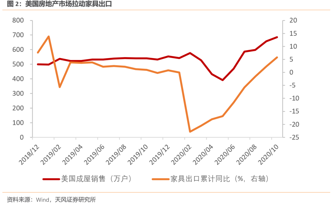 家具制造的景气度改善主要有两方面原因,一是国内商品房销售带动了家装内需,二是海外房地产市场持续火热拉动了家具出口。对比中美两国的房地产市场,外需对行业复苏起到了更大作用。今年7月美国30年期住房抵押贷款固定利率已低于3%,极低的贷款成本刺激了居民的购房需求。占全美住房销售九成的成屋销售从5月的391万户攀升至10月的685万户,新开工在建私屋也同步反弹。在外需的拉动下,家具出口自5月起迅速复苏,9月累计同比增速转正,10月累计同比增速升至5.8%。同样受益于海外房地产市场复苏的行业还包括木材加工、家电制造和部分工程机械。