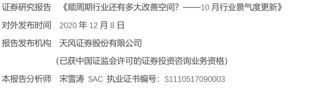 未来随着疫苗落地,原油价格大概率温和回升,石油天然气开采和石油炼焦的景气度有望迎来触底反弹。随着企业利润和现金流的逐渐修复,传统制造业投资还会继续改善,化学原料、化学纤维和专用设备等与制造业投资相关的行业仍有景气度提升空间。消费服务业将出现较大复苏,未来2-3个季度内酒饮料茶制造、烟草制品、纺织服装服饰和皮革制品的景气度改善将比较明显,农副产品加工、食品制造、文体用品和医药制造的复苏斜率可能走平,造纸和纸制品的景气度受环保政策推动可能继续走高,纺织业的景气度变动取决于新兴市场恢复生产的节奏,顶点或在明年年中出现。