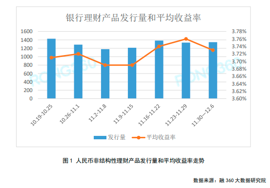 融360大数据研究院监测数据显示,上周(11月30日-12月6日)银行非结构性理财产品发行量共1347只,较上周减少8只。上周人民币非结构性理财产品平均收益率为3.73%,较前一周下跌3BP。