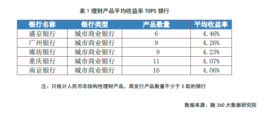 融360大数据研究院对各大银行的理财产品收益率进行排名(周发行量在5只及以上,不含外币理财和结构性理财),数据显示,上周盛京银行理财产品平均收益率为4.46%,排名首位,广州银行产品平均收益率分别为4.26%,排名第二,廊坊银行产品平均收益率为4.23%,排名第三,重庆银行、南京银行产品平均收益率分别为4.07%、4.06%,分列第四、第五。