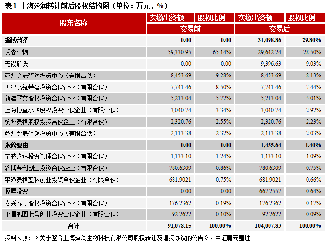 2020年12月4日晚,沃森生物公告称公司拟向淄博韵泽、永修观由转让所持有的子公司上海泽润32.60%的股权,转让价为11.41亿元。在本次交易前,沃森生物持有上海泽润65.14%股权,是上海泽润控股股东,交易完成后沃森生物持股比例下降至28.50%,退居次席,而淄博韵泽持股29.80%,成为上海泽润第一大股东,上海泽润将不再是沃森生物控股子公司。
