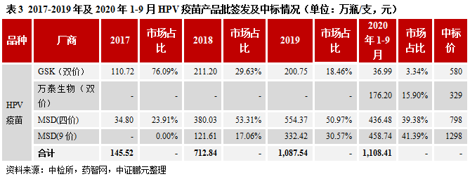 由于多联多价疫苗有着较少的接种次数及覆盖更多血清范围的优势,同时国产疫苗相比进口疫苗的价格优势,多联多价、国产替代已成为未来疫苗行业发展趋势。对比沃森生物已上市的13价肺炎疫苗的成功先例,其子公司上海泽润研发的2价和9价HPV疫苗拥有巨大的市场业绩预期。目前国内HPV疫苗市场分为2价、4价及9价三个品种,其中2价疫苗由葛兰素史克(GSK)及万泰生物生产,4价及9价疫苗由默沙东生产,在国内由智飞生物独家代理销售。2019年HPV疫苗合计获得批签发1,087.54万瓶/支,较上年增长52.56%,总体市场规模增长较快。其中2价疫苗在批签发量在200万瓶/支左右,4价疫苗为554.37万瓶/支,为市场主力品种,9价HPV疫苗2019年批签发量为332.42万瓶/支,同比上升173.35%,呈爆发式增长;三种产品市场占比由2017年的76.09%、23.91%、0%变为2019年的18.46%、50.97%、30.57%。从2价和9价HPV疫苗的市场格局来看,2价国产替代已然形成,如果上海泽润2价HPV上市会面临一定竞争,但依然能从市场分的一杯羹,蚕食GSK市场份额,并同万泰生物竞争2价HPV市场。在最富竞争力的9价疫苗上,目前国内9价HPV疫苗是默沙东独家提供,万泰生物的9价HPV疫苗处于三期临床阶段,上海泽润的9价HPV疫苗计划在一期临床阶段。按照2价、4价、9价疫苗分别的中标价来计算,2019年HPV疫苗市场产值为99.03亿元,接近百亿体量,随着产品市场渗透率的提升,未来几年9价HPV疫苗将占领更多市场份额,市场前景广阔。