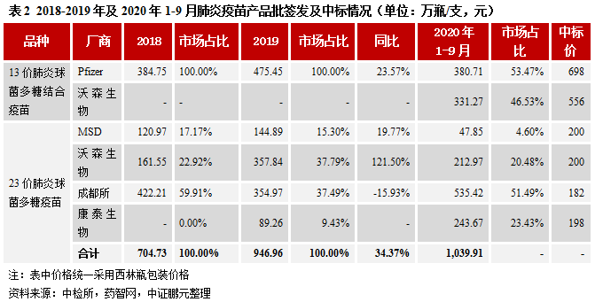沃森生物的13价肺炎疫苗已于2019年12月获批上市,2020年前三季度13价肺炎疫苗批签发量为331.27万支,市场占比已达到46.53%,打破辉瑞一家独大的局面,按照中标价556元计算,销售规模高达18.42亿元。