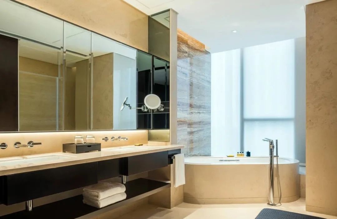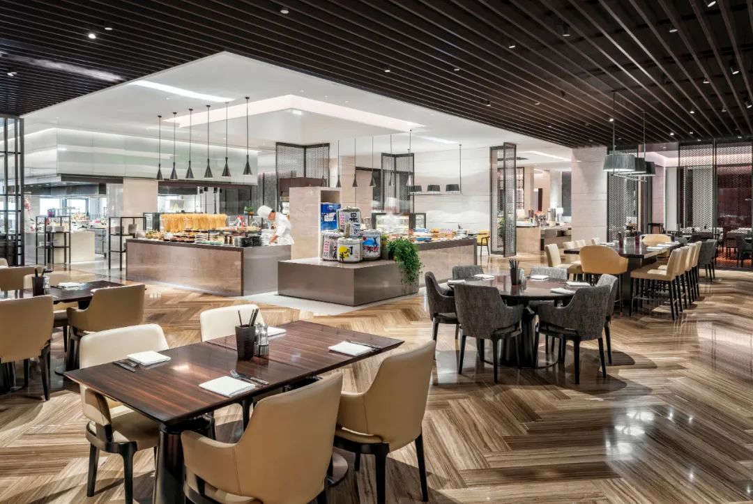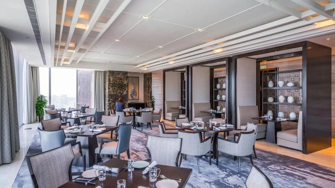 酒店拥有四个风格不同的餐厅。位于酒店45楼的享悦中餐厅提供江南美食。客人可以选择在大厅或贵宾包房享用精致美食。大厅精心陈设多件中国当代艺术作品,显得典雅高尚又有时代气息。此外,餐厅还设7间贵宾包房,每间可容纳8至24名客人用餐。