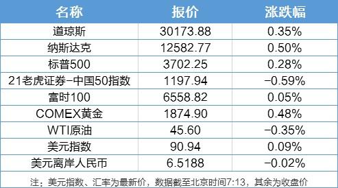 1、美股三大指数集体收涨,标普首次站上3700点,纳指重回3700点上方,连续四个交易日创收盘新高,道指涨逾百点创盘中新高;拼多多涨逾7%,哔哩哔哩涨近4%均创收盘新高;国际金价微涨;油价小幅下跌;欧洲主要股市收盘涨跌互现。21老虎证券-中国50指数下跌0.59%,50只成分股中13只上涨,拼多多、小米集团、舜宇光学科技涨幅居前。