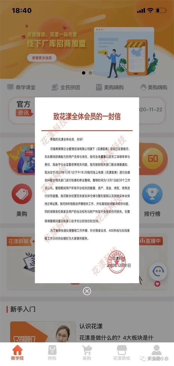 今年12月1日,医美APP花漾医美发布通知称,由于行业监管政策相关问题,其接到相关部门配合调查通知,决定当日进行自查自纠配合相关部门进行检查和停业整顿。整顿日期为30个工作日以内。整顿期间用户所有平台相关的数据、资产、资金、债权、债务进行封存盘整。