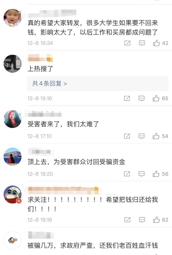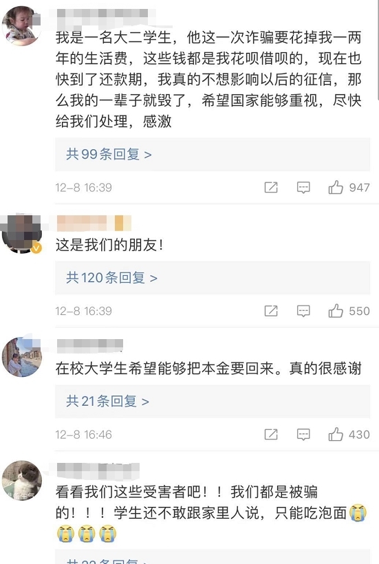 在微博上,不少用户发表评论。基金君观察到,不少用户还是大学生,还有家庭主妇。还有学生借钱投入到这个骗局中,不敢让家人知道。