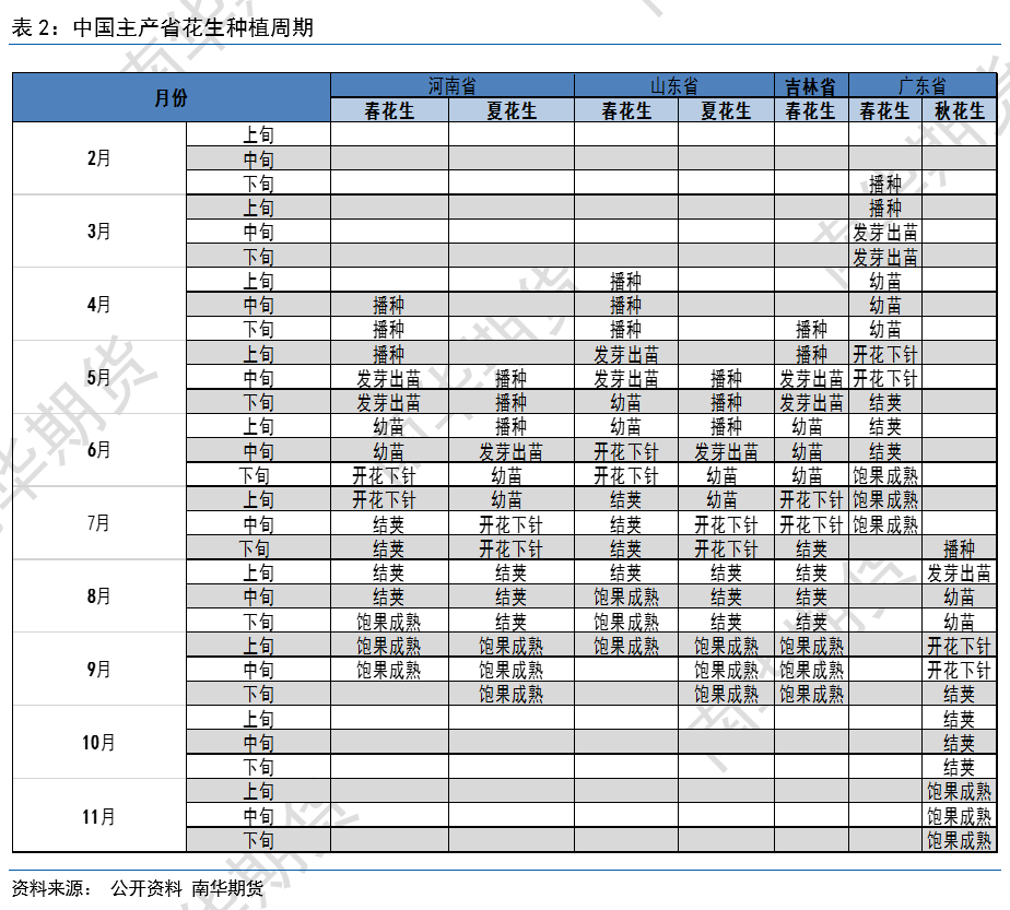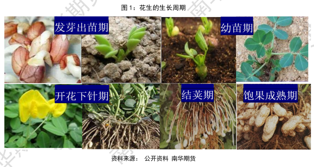 花生整个生长周期可分为发芽出苗期、幼苗期、开花下针期、结荚期、饱果成熟期等五个阶段。其中发芽出苗期和幼苗期又称苗期或前期,开花下针期和结荚期又称中期,饱果成熟期又称后期。其种植周期时长因品种不同而略有差异,其中早熟品种:100~130天、中熟品种:135~150天、晚熟品种150天以上。