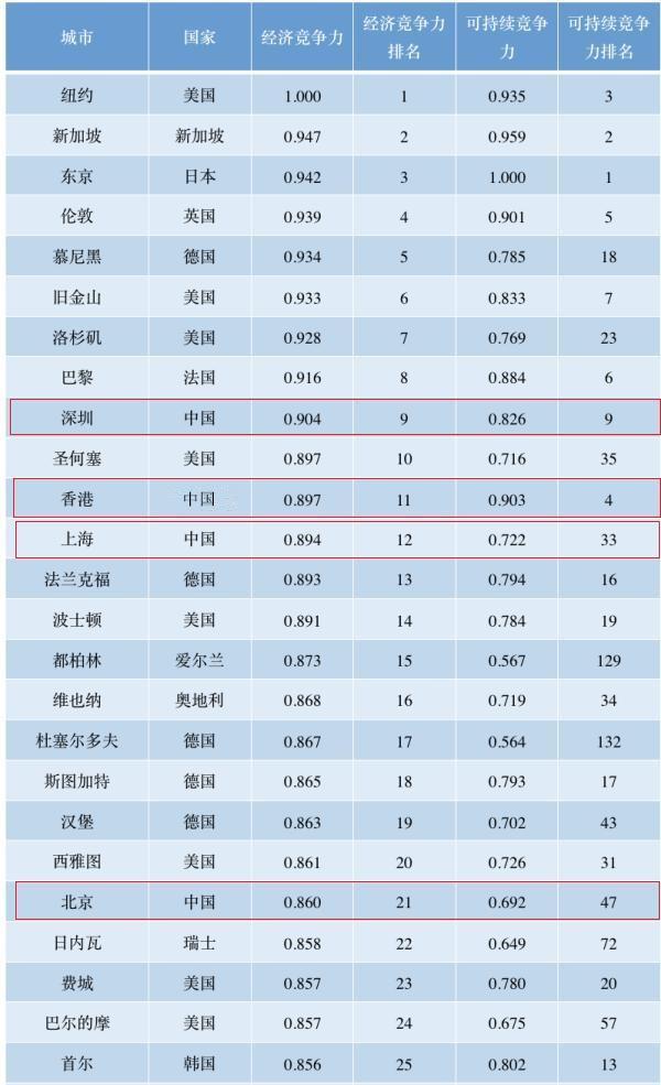 深圳在经济竞争力排名中位列全球第9,这也是中国城市取得的最好排名。其他进入全球排名前20的中国城市还包括香港和上海,分别位列第11名和第12名,北京则位列第21名。