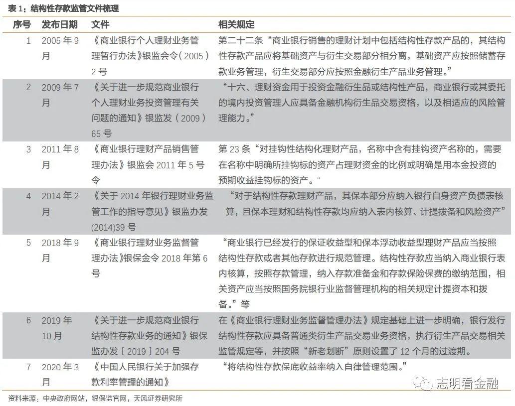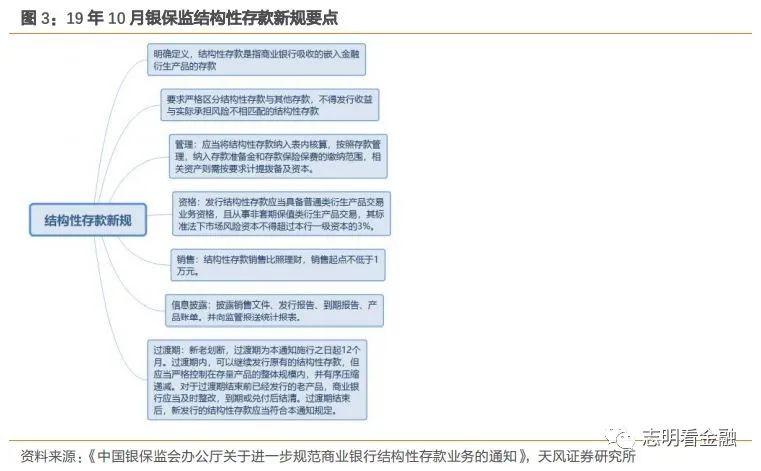 2019年10月18日,银保监会发布了《关于进一步规范商业银行结构性存款业务的通知》,系统梳理了结构性存款业务监管规则,在《商业银行理财业务监督管理办法》规定的基础上进一步明确,银行发行结构性存款应具备普通类衍生产品交易业务资格,执行衍生产品交易相关监管规定等,并按照“新老划断”原则设置了12个月的过渡期。