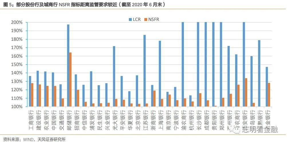 部分股份行和城商行NSFR指标压力较大。截至20年6月末,部分股份行及城商行NSFR指标低于110%,距离100%的监管要求较近,该指标压力较大。近两年地方政府债发行期限较长,年中以来银行信贷投放中中长期的占比较高,也会加大银行流动性监管指标压力。