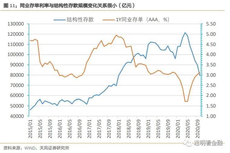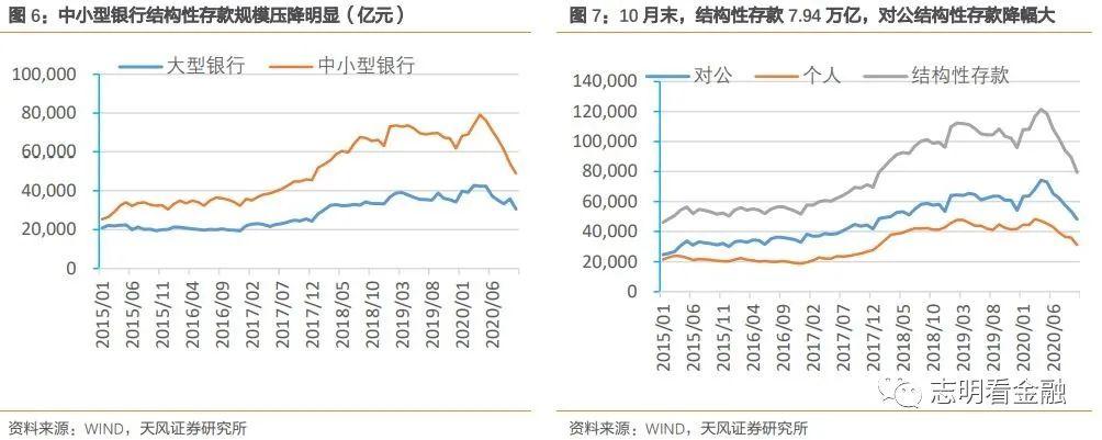 大型银行客户基础较好,存款中结构性存款占比相对较低,因而结构性存款压降压力相对小些。20年5月初-10月末期间,大型银行结构性存款下降1.18万亿,明显低于同期中小型银行3.01万亿的压降规模。