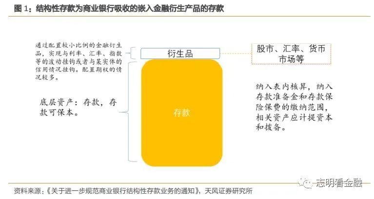 19年10月18日,银保监会发布了《关于进一步规范商业银行结构性存款业务的通知》,该文件明确了结构性存款的定义。“结构性存款是指商业银行吸收的嵌入金融衍生产品的存款,通过与利率、汇率、指数等的波动挂钩或者与某实体的信用情况挂钩,使存款人在承担一定风险的基础上获得相应的收益。”